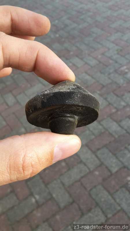 Als ich eben nochmal überprüfen wollte, ob ich die Querlenker und die Stoßdämpfer wieder richtig festgezogen habe (sonst was ja nichts los), habe ich diesen Gummistöpsel unter dem Auto gefunden.