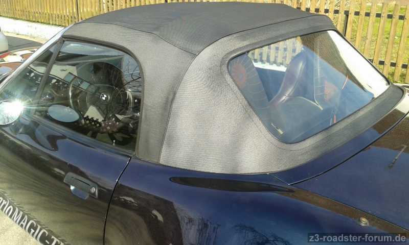 Fürs Neue, wurde die aktuellste Cabrio-Akustikstoffkollektion gesichtet, wie sie auch beim neuen 2er-BMW angeboten wird und die Variante in silber/schwarz gewählt (passend zum Chromscheibenrahmen); mit schwarzer Einfassung und neuer, schwarzer Regenrinne. Heckscheibe nun eingenäht mit schwarzen Fäden. Vom alten Verdeck wurden verwendet: Halteleiste Verdeckkasten, Aluschiene zur Heckscheibenversteifung, ... Spannseile,-Gurte, Dichtungen.