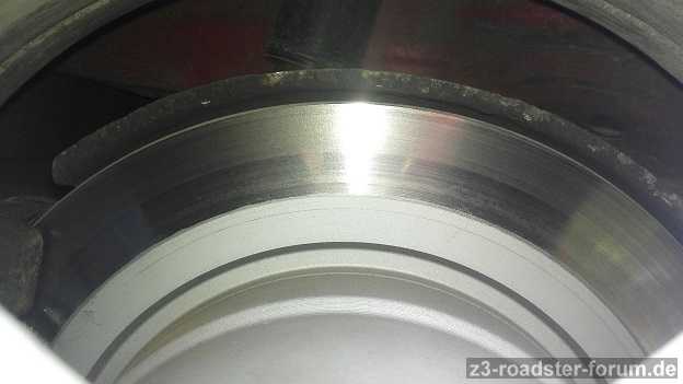Nun bleibt an der rechten Bremsscheibe der innere Rand (ca. 1-2cm) unberührt, d.h. hier ist noch der graue Schutzlack vorhanden. Auf der Rückseite sieht es normal aus.