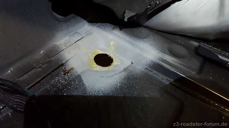 Jetzt habe ich prophylaktisch den Teppich auf der Beifahrerseite zum trocknen hochgestellt. Zum Glück habe ich es jetzt gemacht, denn der Rost fängt gerade erst an.