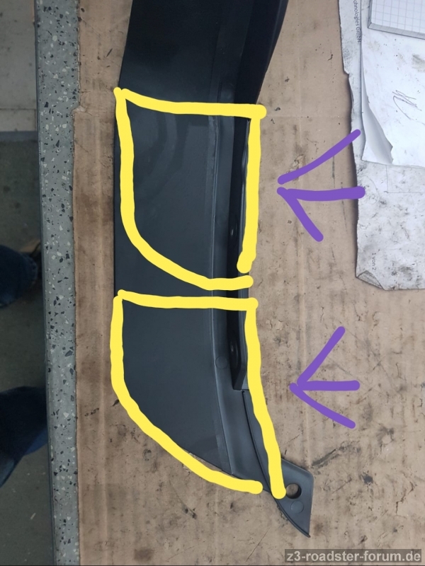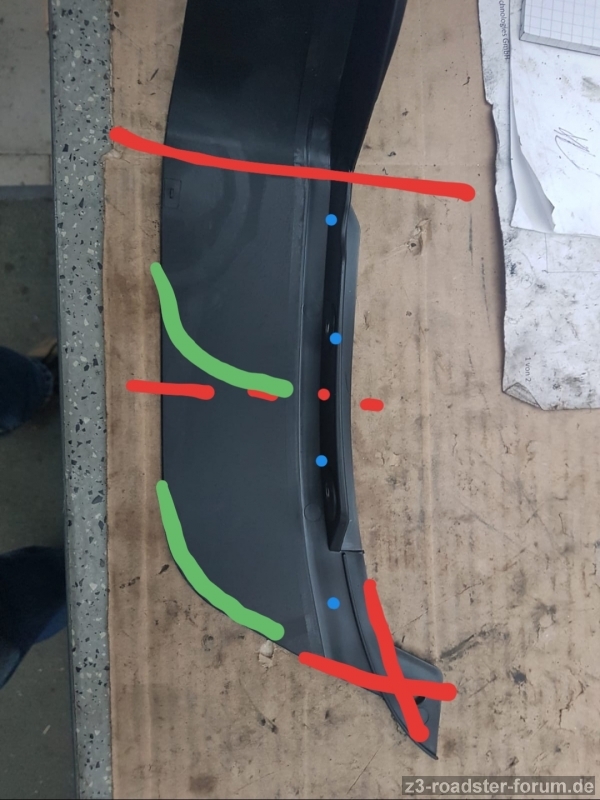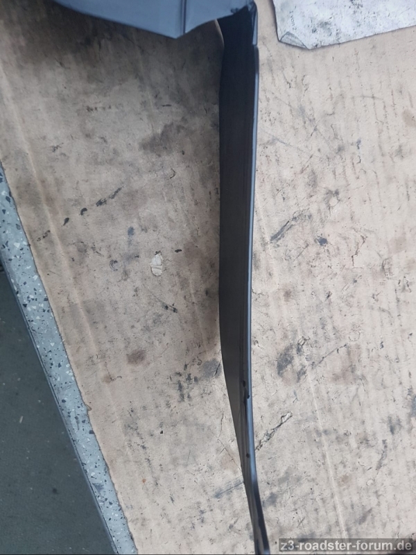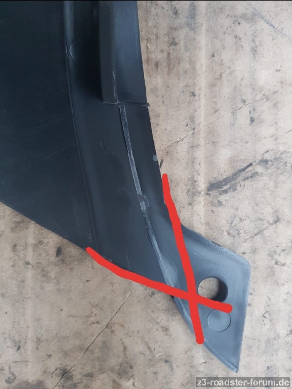 Den nach oben gebogenen Anteil (mit dem Befestigungsloch) der harten Kunststoffleiste so entfernen, dass die Konturen des Verlaufs der Gummierung und des Kunststoffes sich kreuzen und harmonisch eine saubere Ecke ergeben.