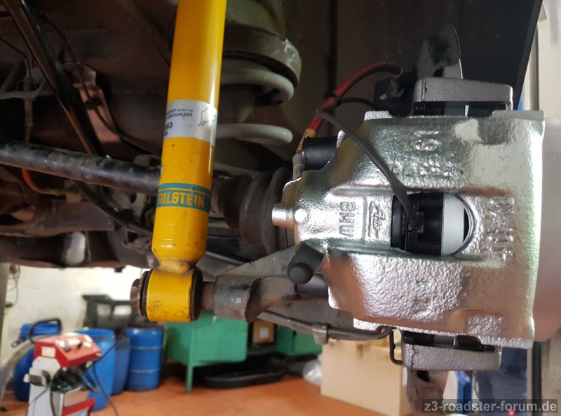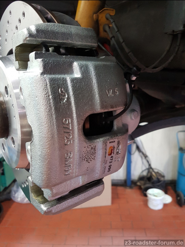 Wichtige Basis für alle Änderungen an der Bremsanlage war der serienmäßig verbaute Hauptbremszylinder im Z3 mit einem Kolbendurchmesser von 23,81mm; dieser hat somit die gleichen technischen Daten wie der im 330i E46, aus dessen ETK die restlichen Komponenten des nachfolgend beschriebenen Bremsen-update´s verwendet wurden. Damit stimmt sowohl die Pedalkraft wie auch der Druck am Bremskolben im Verhältnis zueinander; für das Gutachten ein Killkriterium.
