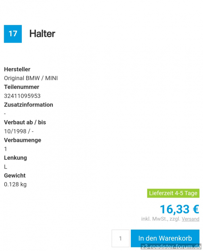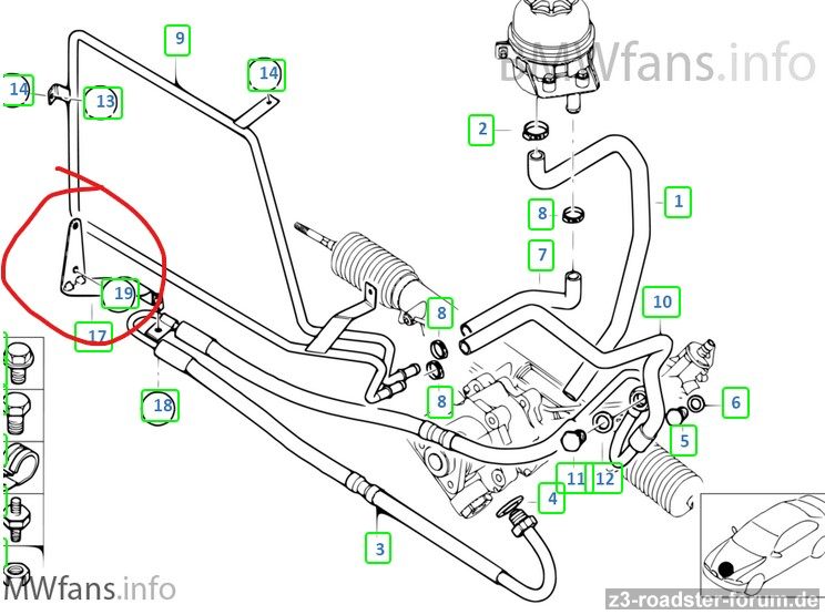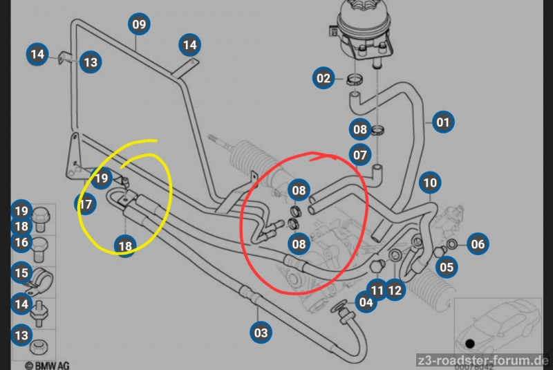 Hallo Leute, brauche euren Schwarmwissen: es geht um die Nr. 17 im angehängten Screenshot (Teilenr.: 32416752284). Kann mir bitte Jemand ein Foto machen, wie/wo das Teil im Fahrzeug befestigt ist? Laut ETK ist es nur bei den FL 6Zyl. Motoren (also M54) verbaut. Müsste Beifahrerseite, knapp über dem Stabilisator sein (oder unterhalb Klimakompressor)