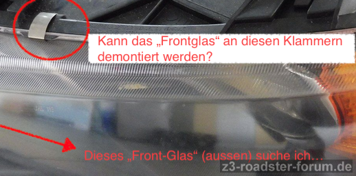 Ich habe ein Bild mitgeliefert, an dem ich das Frontglas zeige (Pfeil). Das Bild ist aber nicht von meinem Scheinwerfer... Desweiteren sehe ich diese Klammern... Kann man damit das Frontglas vom Gehäuse trennen? Wenn ja, bräuchte ich ja nur diese Gläser... und könnte Scheinwerfer besorgen, die gern auch abgebrochene Steckverbinder etc. haben können...