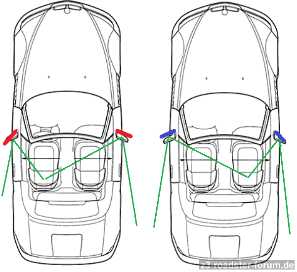 Achtung: Spiegelfüße und Dichtungen vom Rechtslenker sind anders! Das erklärt sich durch die nötige unterschiedliche Grundstellung der Spiegel, wie im folgenden Bild gezeigt: