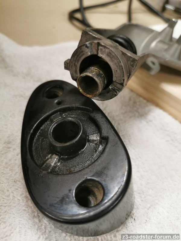 Das Spiegelglas ist dann auf den Motor geklippst. Am einfachsten lässt es sich entfernen wie bei Z3-Spiegelwelt beschrieben (oben hineindrücken, von unten mit einem Schraubenzieher das Glas direkt vom Stellmotor hebeln).