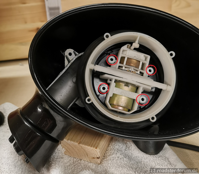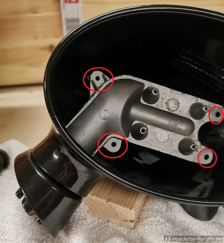 Das Gehäuse ist nun mit vier selbstschneidenden Schrauben (Torx) an den vier Ohren des Skeletts befestigt, beim Serienspiegel wie schon erwähnt zweiteilig (Schrauben im Bild entfernt).
