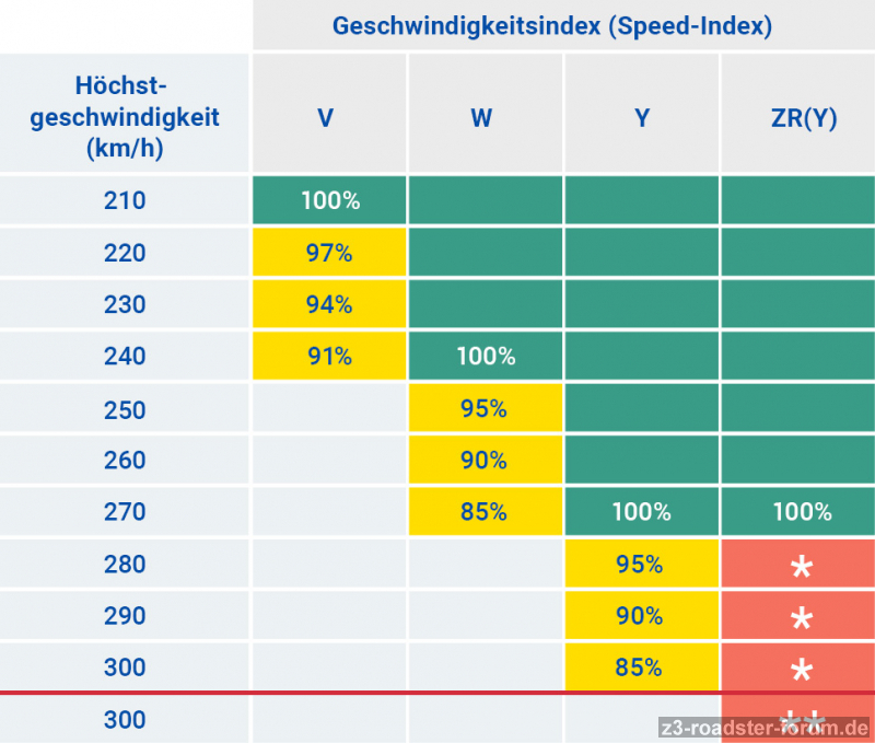 - über 300 km/h: es reicht rechtlich ein Reifen mit einem Geschwindigkeitsindex (Kennbuchstaben) "Z"