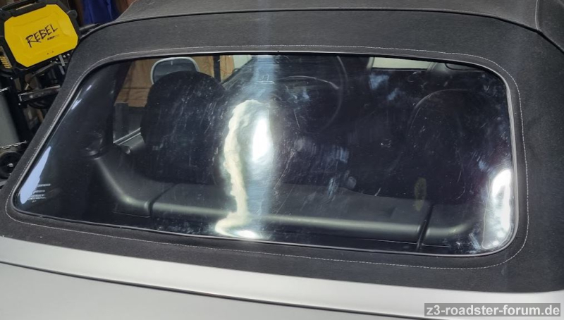 Momentan versuche ich die alte Scheibe zu Übungszwecken wieder einzubauen, natürlich möglichst ohne den verdeckseitigen Reissverschluß zu schädigen.
