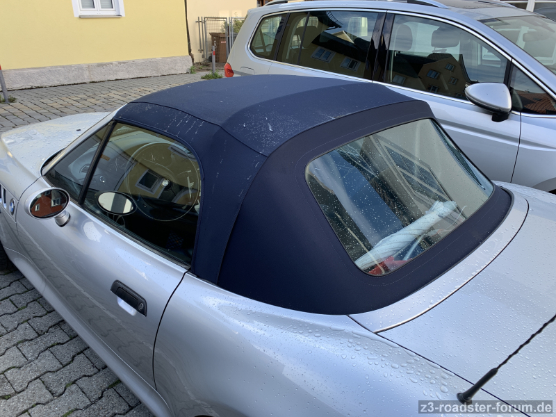 Ende Juli hat meiner ein neues blaues Verdeck mit Regenrinne und schickem Innenhimmel bekommen. Sehr netter Kontakt, sehr kompetente Arbeit mit einem tollen Ergebnis. Montagedauer ca. 6 Stunden. Ich durfte auch ein wenig mithelfen. Am Anfang geht das neue Verdeck sehr schwer zu (nichts für zarte Hände!), das hat sich aber bis jetzt gegeben und die benötigte Handkraft ist heute die gleiche wie beim alten Verdeck. Die Scheibe faltet sich anfänglich auch nicht immer wie gewünscht. Ich habe nach dem Aufklappen immer die Scheibe (natürlich mit Frotteetuch) in eine schöne Wulst gelegt und auftretende Knicke sofort korrigiert. Auch das hat sich mittlerweile erledigt, die Scheibe hat gelernt und legt sich heute von selber sauber ein.