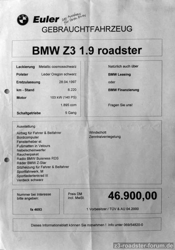 Ich habe gestern mal in meinen Unterlagen gekramt und tatsächlich noch das Verkaufsschild und die Verträge meines früheren Z3 gefunden.