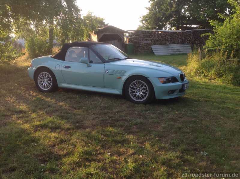Mein Name ist Kim Andreas, ich komme aus dem schönen Nordhessen, und bin seit heute zusammen mit meiner Frau stolzer Besitzer eines BMW Z 3 Roadsters. Der kleine ist in 1996 gebaut und hat 178000 km runter, er hat den 1,8 l Motor und ist türkisgrün! Er war die erste Wahl meiner Frau, und die hat sich auf der Heimfahrt bestätigt. Der Motor läuft prima, keine Geräusch vom Differenzial zu hören, das Getriebe lässt sich sauber schalten, das Verdeck sieht recht gut aus und die Plastikscheibe ist ebenfalls in sehr gutem Zustand! Gut ein paar kleine Macken hat er, aber nichts Weltbewegendes. Wegen der kleinen Macken hoffe ich auf die geballte Fachwissen dieses Forums.