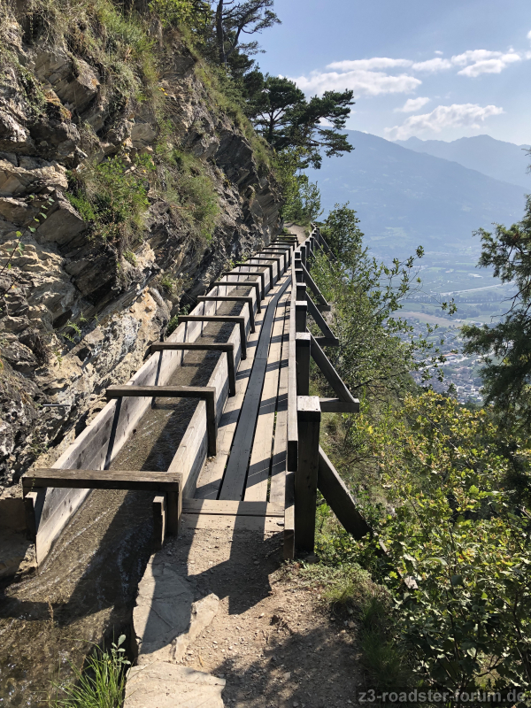 Auf der Straßenkarte sind viele schmale Straßen mit vielen Kurven eingezeichnet, die kleine Ortschaften verbinden. Diese teilweise sehr schmalen Straßen sind ohne die Bremser WOWA/WOMO/Radler super zu befahren. Nur wenige Fahrzeuge sind da unterwegs. Die Orte sind oft mit historischen Gebäuden und Sehenswürdigkeiten. Besonders die Suonen im Wallis sind eine Attraktion. Der französische Teil der Schweiz ist super um den ZZZ artgerecht zu bewegen, den Suonen/Bisse entlang zu wandern (flach neben Wasserrinnen, über Hängebrücken, schmalen Pfaden an Abhängen) oder richtig hohe Berge erklimmen (auch mit Seilbahn).