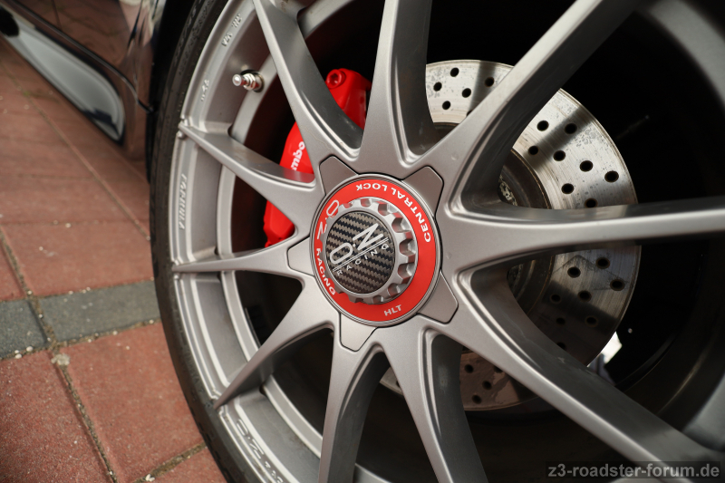 2,8er DV Handschalter, KW V2 mit moderater Tieferlegung in Kombination mit den 18“ OZ Felgen, H&R Stabis vorn und hinten. Auf der Vorderachse arbeitet noch eine innenbelüftete Brembo-Anlage die wirklich biss hat und sich herrlich dosieren lässt.