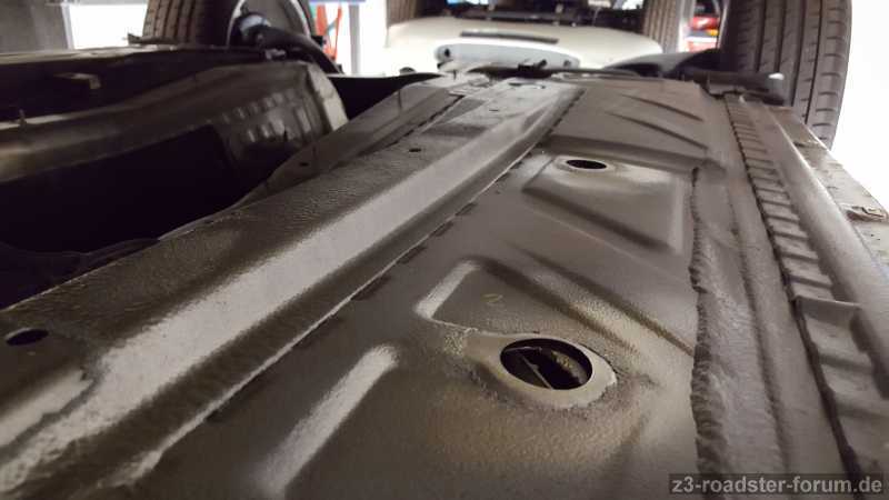 Der letzte Rost um die 6 großen Stopfen im Unterboden ist entfernt, die Seitenschweller/ Längsträger sind komplett fertig und auch das Heckabschlussblech wurde nach der Rostentfernung in Wagenfarbe lackiert. Davon sieht man nämlich später auch im zusammengebauten Zustand etwas.
