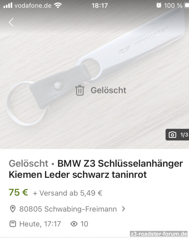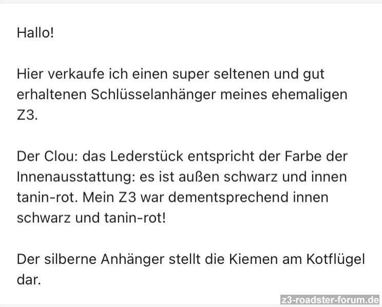 RunnerAZ36 hat geschrieben:Ein seltener Z3 Kiemen-Schlüsselanhänger bei Ebay-Kleinanzeigen für 75,- plus Versand.