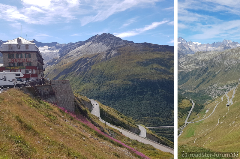 Hotel Belvedere am Furka, ein beliebter Aussichtspunkt + Fotomotiv. Ich wollte wieder abfahren und vor mir auch zwei andere. Nicht möglich, da ein GT RS quer in der Ausfahrt stand, der Fahrer minutenlang Selfies von sich mit Auto im und außerhalb des Autos machte. Millimeterarbeit um da vorbeizukommen. Die vor mir machten ihrem Ärger bereits Luft, interessierte den GT RS nicht.