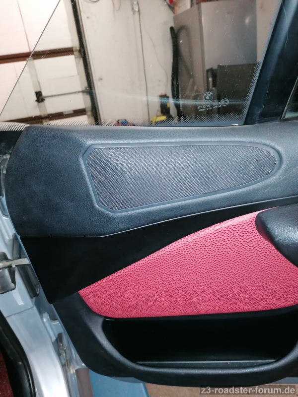 Da die Verkleidung schon mal ab war die Gelegenheit genutzt und das Lautsprechergitter lackiert und mit neuem Stoff hinterlegt.