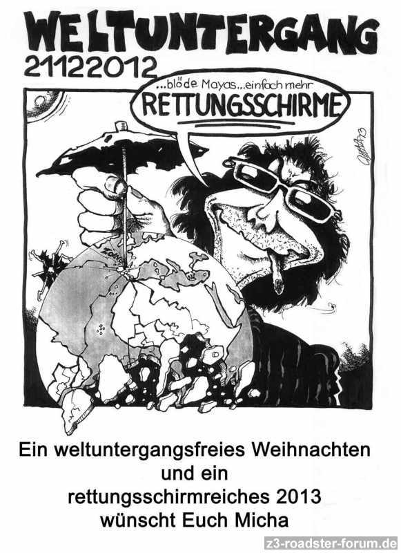 In Griechenland muss der Weltuntergang leider auch ausfallen ….. Generalstreik. Die Amis wiederum sehen dem Ereignis gelassen entgegen. „Wir sind vorbereitet“, so ein Sprecher der Waffenlobby.
