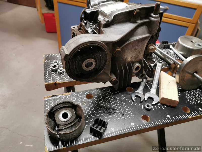 Neue Tonnenlager und Längslenkerlager eingezogen, Difflager rausgepopelt (ging erstaunlich schnell mit einer Säbelsäge mit Metallblatt und einem breiten Schraubendreher + Hammer), neues Difflager eingezogen, und Achse wieder zusammengepuzzelt. Fertig!