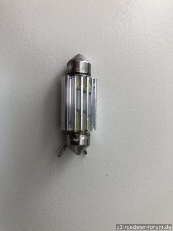 Hallo Ich habe meine Innenbeleuchtung auf LED umgestellt. Habe dafür LED-Sofitten bei ebäh gekauft (36mm Innenleuchte, 42mm Kofferraumleuchte). Diese hatten die schlechte China-Qualität. Die Kappen kamen an den Kühlkörper, was der zugehörigen 10A-Sicherung das Leben kostete. Also habe ich die Kappen mit Zweikomponenenkleber fixiert und anschließend deren Rand zum Kühlkörper hin weggedremelt. Mit Ohmmeter den Erfolg geprüft. Damit die Sofitten sich nicht um die eigene Achse drehen können, habe ich den kleinen Draht aufgelötet. Die Lichtausbeute ist nun eine ganz andere und es ist bedeutend heller.