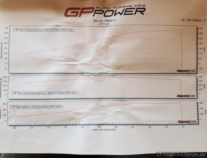 Leider wurde das Prüfstandprotokoll der Serienmessung nicht mitgegeben, weil es dem Regen zum Opfer gefallen ist; darum sieht das Prüfprotokoll am Ende der Abstimmung auch so mitgenommen aus.