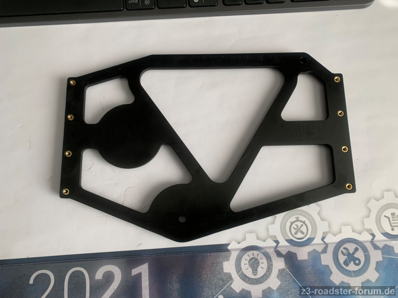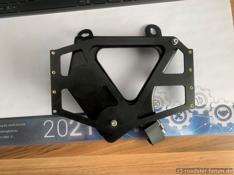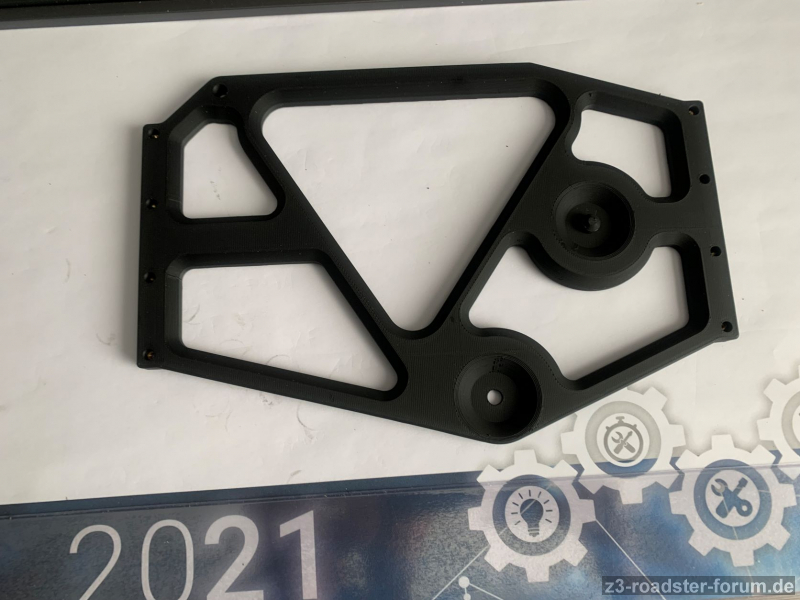 Auf der Rückseite sieht man, dass sich der Adapter an der Kontur vom originalen Halter orientiert und somit nachher plan aufliegt. Zusätzlich ist noch ein Stift zur Zentrierung angebracht, da dieses Schraubenloch unter der Endstufe liegt und somit eh nicht zu nutzen wäre: