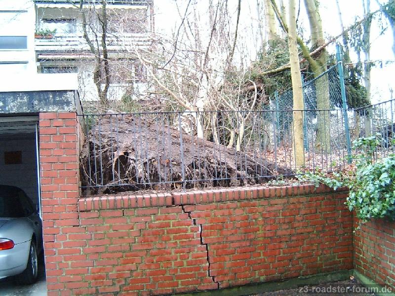 Na ja, Gott sei Dank ist der Baum dann nach links gekippt, hat aber trotzdem die Garagenwand beschädigt. Wäre er auf’s Garagendach gekracht, hätte ich mich hier wohl wieder abmelden müssen ...