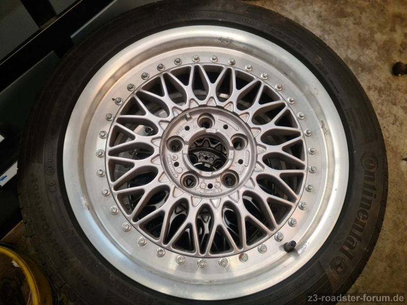 Zuerst eine Grobreinigung mit sehr viel Felgenreiniger, verschiedenen Bürsten und Dampfstrahler, danach eine Feinreinigung mit viel Putzarbeit (Zahnbürsten haben sich bewährt) und einigen Dosen Bremsenreiniger. Dabei stellte es sich heraus das die Schrauben nicht angerostet sondern nur mit Bremsstaub verklebt waren. Danach viel Schleifarbeit dort wo sich der Klarlack abgelöst hat und an den Bordsteinkontakten. Dann wurden die Felgen mit je 2 Schichten BMW Felgensiber und 3 Schichten Klarlack ohne Nasen oder Läufer lackiert und neue Reifen montiert.