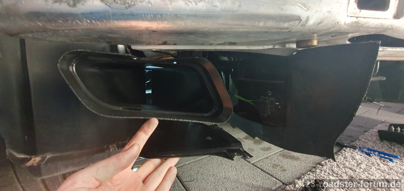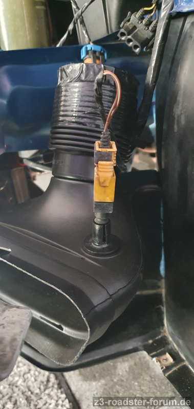 Schön beim Wechsel der Front beim 4-Zylinder ist die Tatsache das der Temperaturfühler auch auf der Fahrerseite platziert ist. (Beim 6-Zylinder ist dies nicht der Fall - dort sitzt er rechts.) Dieser steckt dann einfach im linken Bremskühlschacht. Den Schnorchel zum LuFi-Kasten hab ich mangels Umsetzbarkeit stillgelegt und abgeklebt.