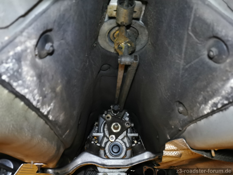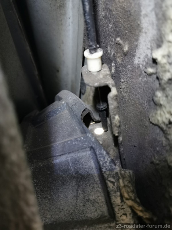 Also Radhausschale raus und mal drunter geguggt. Stellmotor ist da, tut auch noch, aber der Stift, der die Klappe verriegeln soll guggt nicht aus dem Loch. Und die Führungsbuchse fehlt auch. Also mal rausgebaut das Geraffel: Na klar, kann ja gar nicht. Der Stift ist abgebrochen.