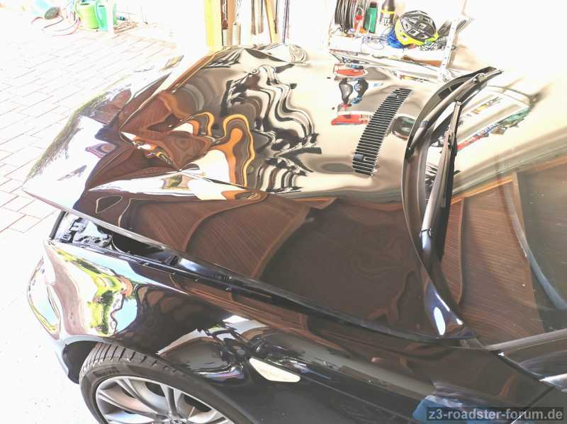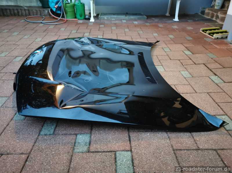 Wie komm ich drauf? Nun... Ich hab bei meinem Zetti nach dem ZKD-Wechsel nun noch den fälligen Ölwechsel gemacht, und dann bei meinem E46 cabrio gleich mit. Tja und dann ist es passiert... Ich wollte nach dem kurz laufen lassen nochmal zur Sicherheit den Ölstand kontrollieren, hatte die Haube wohl dafür schon entriegelt und wurde dann abgelenkt. Kurze Zeit später mit der Family mit offenem Verdeck los zum Badesee, und dann ist es passiert... Gottseidank auf einem geraden Stück und kein Verkehr (und nicht mit dem frisch reparierten Zetti) . Es tat einen riesen Schlag und ich hatte die Haube vor der Nase. Brutal mit welcher Gewalt der Fahrtwind die Haube umschmeist. Das Ding ist komplett hinüber, die ganze Struktur verbogen, quasi auf links gedreht. Ein Wunder dass die Windschutzscheibe nicht gesprungen ist. Wie konnte das passieren? Beim Zetti wohl unwahrscheinlicher, weil die Entriegelung einteilig ist, aber beim E46 ist der Mechanismus zweiteilig, und der war tatsächlich durch altes Fett in Verbindung mit Dreck schwergängig und hing "offen" fest