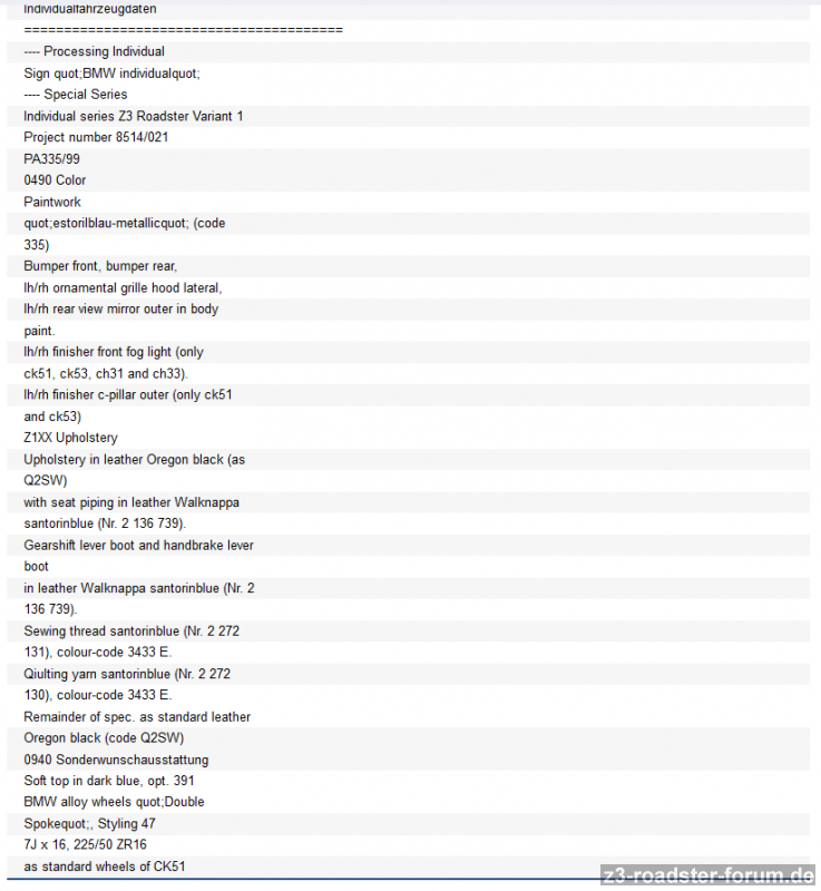 nachdem ich heute u.a. rausbekommen hatte, dass die blauen Leder in meinem Zetti Santorin Blau sind, dachte ich, dass ich bei BMW mal mit der VIN anfrage, ob die noch mehr oder andere Infos haben. Gelesen hatte ich, dass man da anfragen kann und die recht schnell und unkompliziert schicken was die so finden. Wie bei vielen Dingen ist es auch hier: „EINFACH SO“ WAR EINMAL!