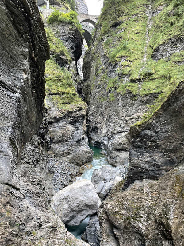 Gebucht wurde das Hotel Rofflaschlucht. Wir wollten auch etwas wandern, Schluchten und interessante Orte besuchen. Die Anfahrt vom Süd-Westen über Lörrach-Rheinfelden-Zürich-Chur-Ausfahrt Bonaduz-Thusis-Andeer-Rofla. Das Hotel ist unter Denkmalschutz, Holzbau, Zimmer mit Bad und welche mit GemeinschaftsBad/WC. Sehr sauber, super Frühstück, sehr gutes Abendessen. Bezahlbar ! Die Schlucht hinter dem Hotel war die erste Aktion. Mit Rheinfall (Hinterrhein), hinter dem man durchgehen kann.