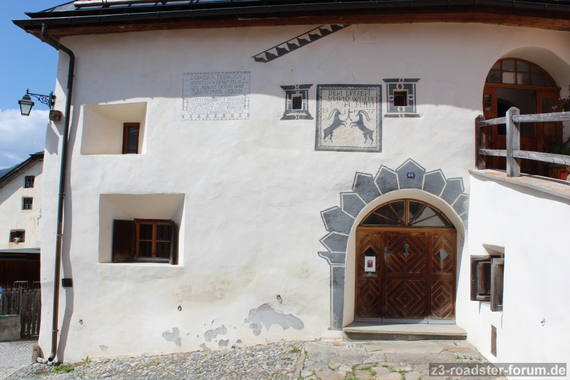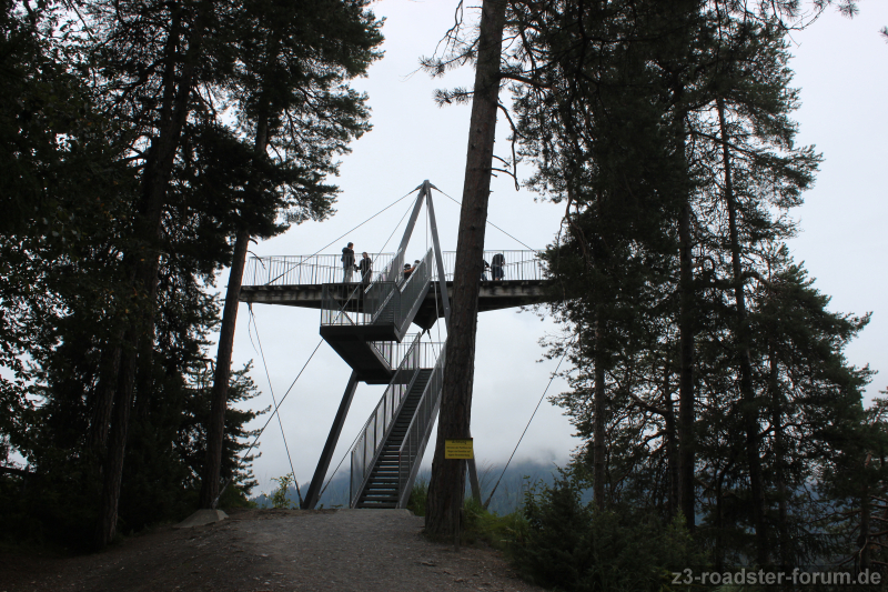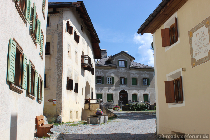 Tag 1. Fahrt in die ViaMala Schlucht, sehr imposant und lohnenswert. Weiter nach Flims. Dort 45min Fußweg zur Aussichtsplattform Il-Spir. 380m über der Vorderrheinschlucht. Fahrt nach Ilanz, Ort mit Bauten aus dem 16. u 17. Jahrhundert, Stadtmauer, rotes und barockes Tor, Margaretenkirche als Zentrum der Reformation mit kuriosen Totentanz-Malereien, ein nackter Tod beim Schachspiel …