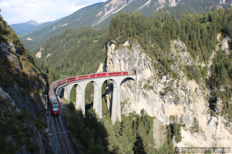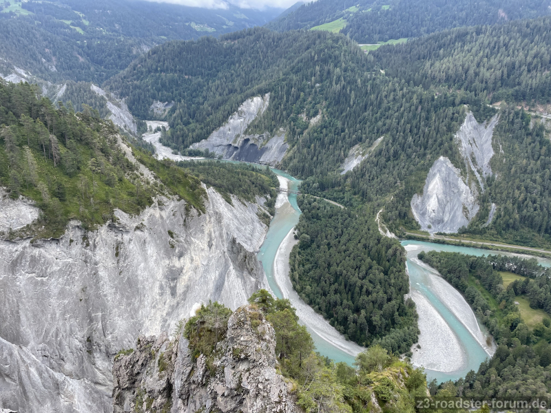 Weiter nach Castrisch-Schlüein-Valendas-Versam, tolle Straße der Schlucht entlang mit Aussicht, Möglichkeiten runter ans Wasser, zu Fuß zur Eisenbahnbrücke. Mit Glück kommt der Glacierexpress vorbei. Über Bonaduz zurück zu Rofla.