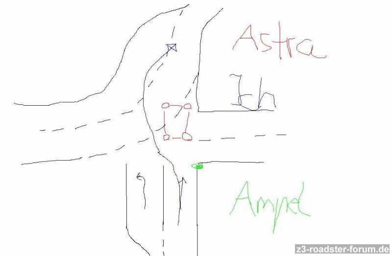 Also ab auf die Hauptstraße mit dem Zetti und auf die erste Kreuzung mit Ampel zu. Die Ampel war rot, dahinter stand ein Opel Astra. Die Ampel ist einspurig für geradeaus und hat zudem eine Linksabbiegerspur.