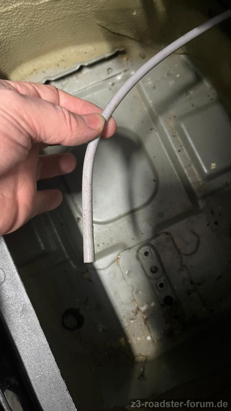 Gestern habe ich die Batterie in mein Z3 ausgetauscht - und habe den abgebildeten Schlauch in der Mulde gefunden. Ein Ende ist fest. Und das andere (wie man sieht) ist lose.