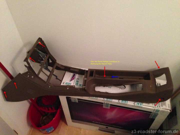 Habe nun die beiden Balge (Schalthebel und Handbremse) entfernt und versucht es hinten anzuheben und nach hinten zu ziehen. Allerdings ohne Erfolg, also es geht nicht aus den Führungen raus.