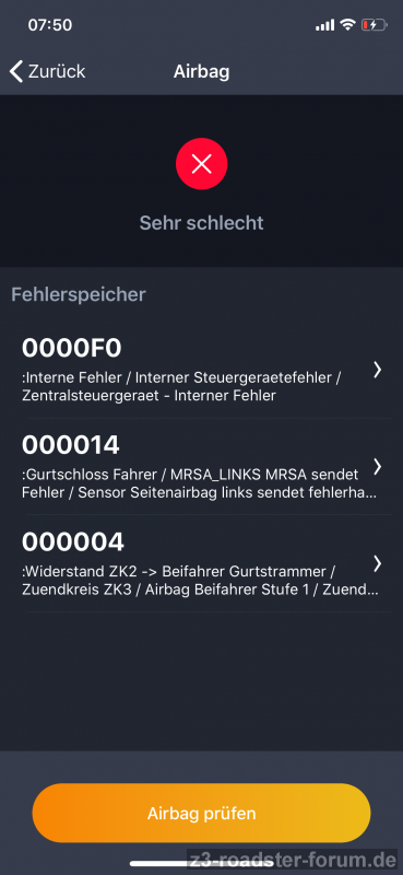 Das Problem mit dem Airbagsteuergerät und den MRSA-Sensoren ist bekannt. Bei Dir scheint gleich alles auf einmal die Grätsche gemacht zu haben. Allerdings kann ich mit den Carly-Fehlern nicht so viel anfangen. Fehler 14 Gurtschloss/MRSA macht für mich keinen Sinn. Entweder ist was am Gurtschloss, oder am MRSA (Seiten-Airbag-Sensor). Der MRSA sitzt unter dem Teppich unter dem Fahrersitz. Dazu muss der Sitz raus. Die gehen gern mal kaputt (hab ich auch auf der Beifahrerseite). Manchmal hat man Glück und es ist auch einfach nur ein Kontakt/Korrosionsproblem. Nach meinen Recherchen hilft aber dauerhaft nur der Austausch der Sensoren. Gebrauchte haben meist das gleiche Problem, daher wird empfohlen auf die Version 4 (?) aus dem E46 (?) umzurüsten. Dazu braucht man aber auch das passende Steuergerät und es muss codiert werden. Da muss man also schon tiefer eintauchen. Ich schieb das auch noch vor mir her...