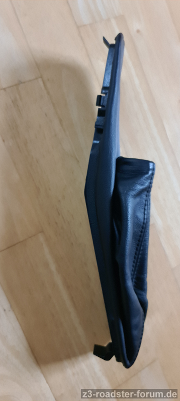 Der Handbremssack ist von innen mit einem Kabelbinder am Griff befestigt; einfach den Handbremssack ganz nach vorne ziehen, sodass er quasi umgestülpt wird, dann den Kabelbinder abzwicken. So kann man den Sack problemlos über den Griff ziehen.