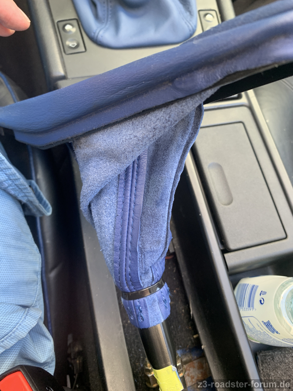 Der Griff des Handbremshebels ist nur auf den runden Metallhebel aufgeschoben.