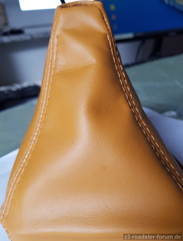 Nach einiger Suche hab ich für 20€ Lederreststücke von einer Rücksitzbank in gutem Zustand und ohne Knickstellen geebayt. Dann zum Sattler, der mir einen neuen Schaltsack genäht hat.