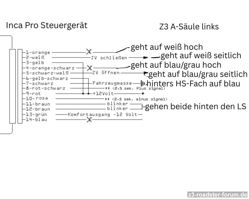Bl/Gr ist das Motor-Signal für Aufschließen, Weiß das Motor-Signal für Zuschließen. Darüber gibt die IncaPro die Signale ans Fahrzeug. Wo man sich da dranklemmt, ob direkt hinterm Zentralmodul, oder irgendwo auf dem Weg zu den Stellmotoren in der Tür (Fußraum links/rechts bei den Lautsprechern) ist egal.