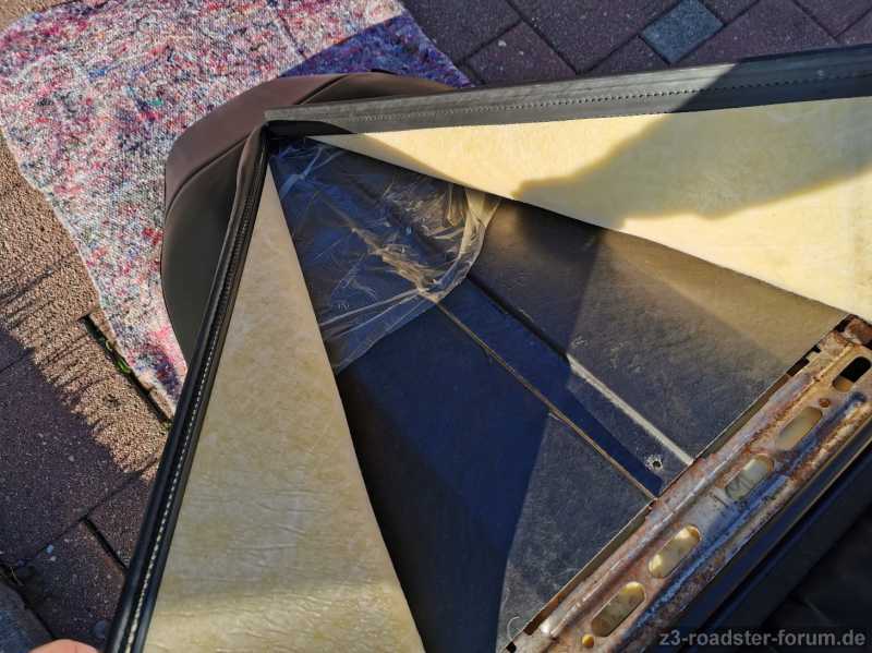 Die Fiberglasschale ist aber nicht nur ziemlich spröde und bricht leicht, sondern scheint zudem am Rand des Kopfteils angeklebt. Einfach rausziehen wie in der Anleitung geht nicht. Ich musste das mühsam losbrechen durch vorsichtiges hin und her... Irgendwann löst es sich dann, beim Fahrersitz ist oben ein Stück herausgebrochen, aber nicht weiter schlimm.