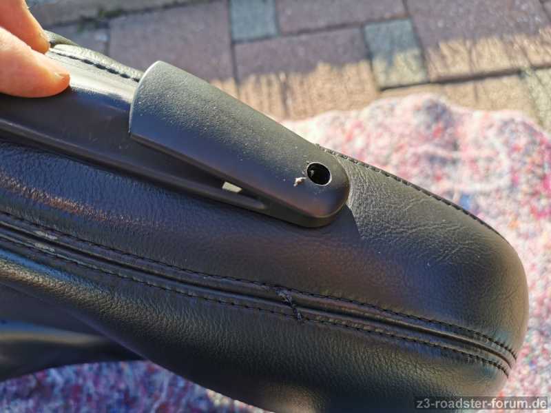 Jetzt kommt man mit dem gebauten Werkzeug auch an die obere Befestigung. Das Ausbohren der alten Spange ist tatsächlich unspektakulär. Die beiliegenden neuen Gegenplatten braucht man nicht, die alten sind eingenäht und bleiben an Ort und Stelle.