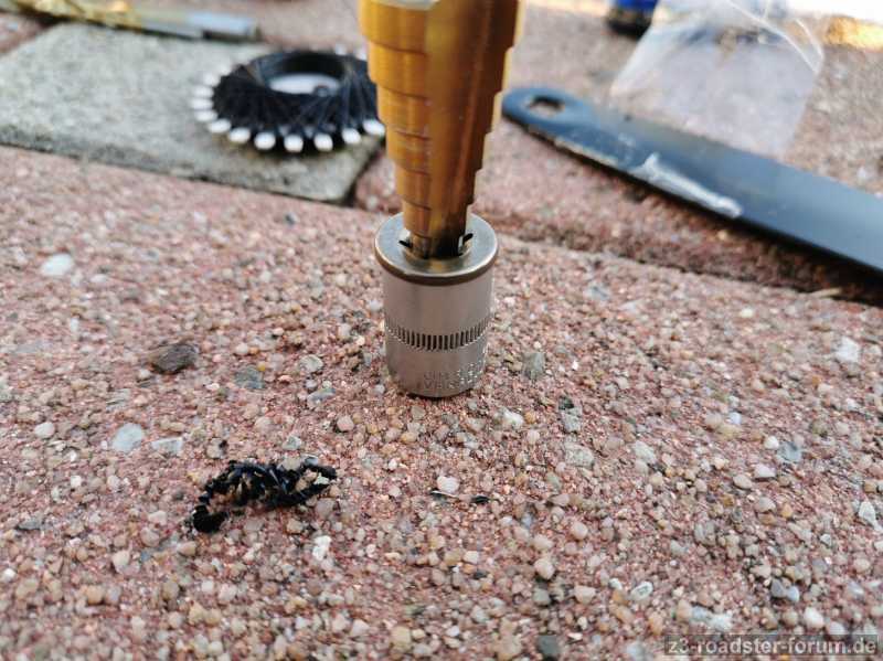 Als erstes hab ich mir das "Spezialwerkzeug" aus der Anleitung gebastelt. Das ging fix. Mit der Dreiecksschlüsselfeile hab ich an einer Seite der Mutter innen noch eine Kerbe für den Faden gemacht, sonst reißt der sofort durch wenn er zwischen Mutter und Sicherungsring scheuert.