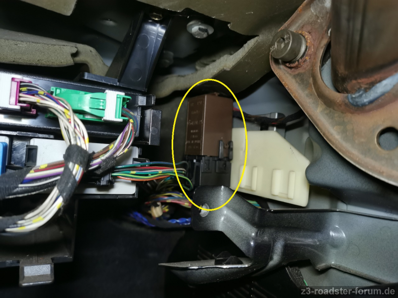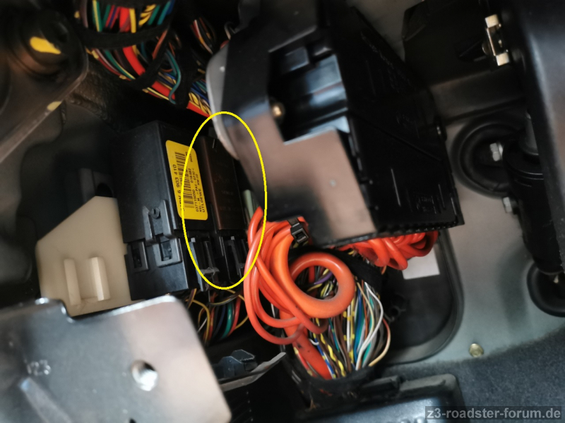 Wenn man nun also möchte dass es blinkt, ist zunächst einmal wichtig zu verstehen, wie die Zentralverriegelung (= Teil des Grundmoduls) überhaupt mit den Blinkern kommuniziert. Hier kommt der sogenannte Crash-Alarmgeber ins Spiel (Bild 1, rechts). Das ist ein Bauteil, das aussieht wie ein Relais und sich je nach Baujahr an der Außenwand links (Fahrerfußraum, ab späte '99er FL) oder rechts (Beifahrerfußraum, bis 1999/frühe FL) befindet (Bild 2 / 3). Diese kleine Elektronik ist mit dem Grundmodul verbunden und kann auf Signalisierung des Grundmoduls hin in die Signalleitung zwischen Warnblinkrelais und Warnblinktaster eingreifen. Zieht man diese Leitung nämlich auf Masse, lässt das Warnblinkrelais die Blinker blinken.