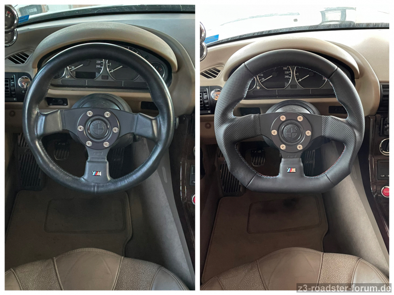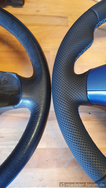 Wenn man die beiden Lenkräder nun mal gegenüberstellt fällt der größere Umfang, als auch der farbliche Unterschied deutlich auf.