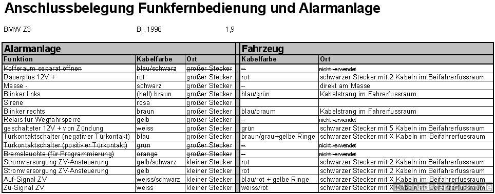 Hier geht es spezifisch um die InPro ZV-Fernbedienung Nr. 4153 und um den BMW Z3 - im Zetti gab es wohl zwischen 97 und 98 mal ne Umstellung der Kabelfarben. Deshalb schreibe ich die beiden möglichen auf.